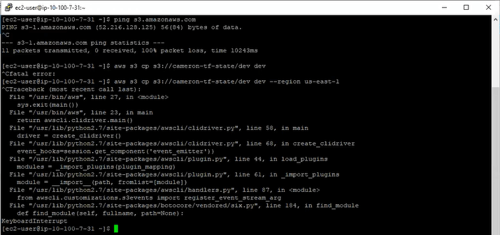 While Cameron could SSH to the test server through the OpenVPN server, he couldn’t use the AWS CLI to access his S3 bucket. The call consistently hangs for as long he’s willing to wait. He tried multiple S3 commands, multiple buckets, multiple objects, and multiple configuration options — they all failed via timeout. You can see that Cameron also tried to specify “--region” which he heard might help resolve to the correct region. It was easy to try, but it didn’t work.