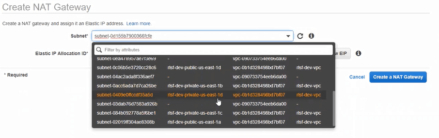The first 8 subnets are the ones that matter, each name prepended with “rslf-dev-”. There are 4 private and 4 public subnets total, split across 4 availability zones.