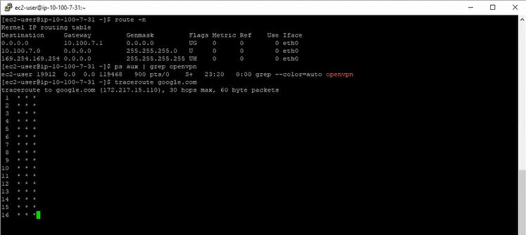 Theory #3: There must be a problem with the route tables on the instance. We looked at OpenVPN. We looked at traceroute. We looked at the default routes on the test server. We compared them against other instances, our own computers, and previous knowledge. Nothing looked out of the ordinary. As much as I would have loved for it to be a problem with OpenVPN (initial configuration can be tricky), it wasn’t involved at all. The test server could communicate with every private IP address on the network, in every availability zone, in public and private zones, including the subnet controllers at 10.*.0.1.